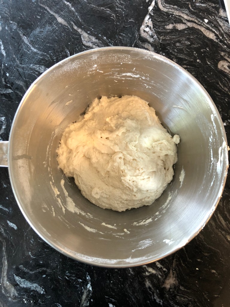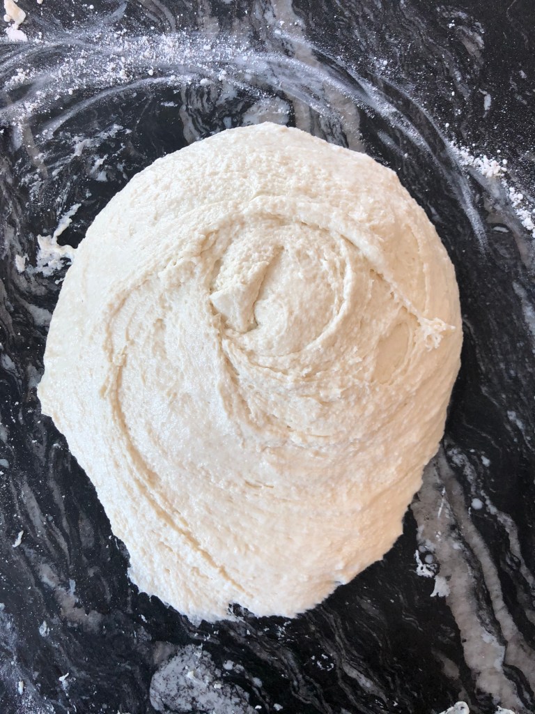 4. Turn dough out onto a heavily floured surface, flatten to knock out air bubbles, and knead to make firm, you may add flour as needed. My dough was veryyyy sticky and needed a lot of flour added (about a cup more). Not sure where I went wrong but the final product was still light and delicious.